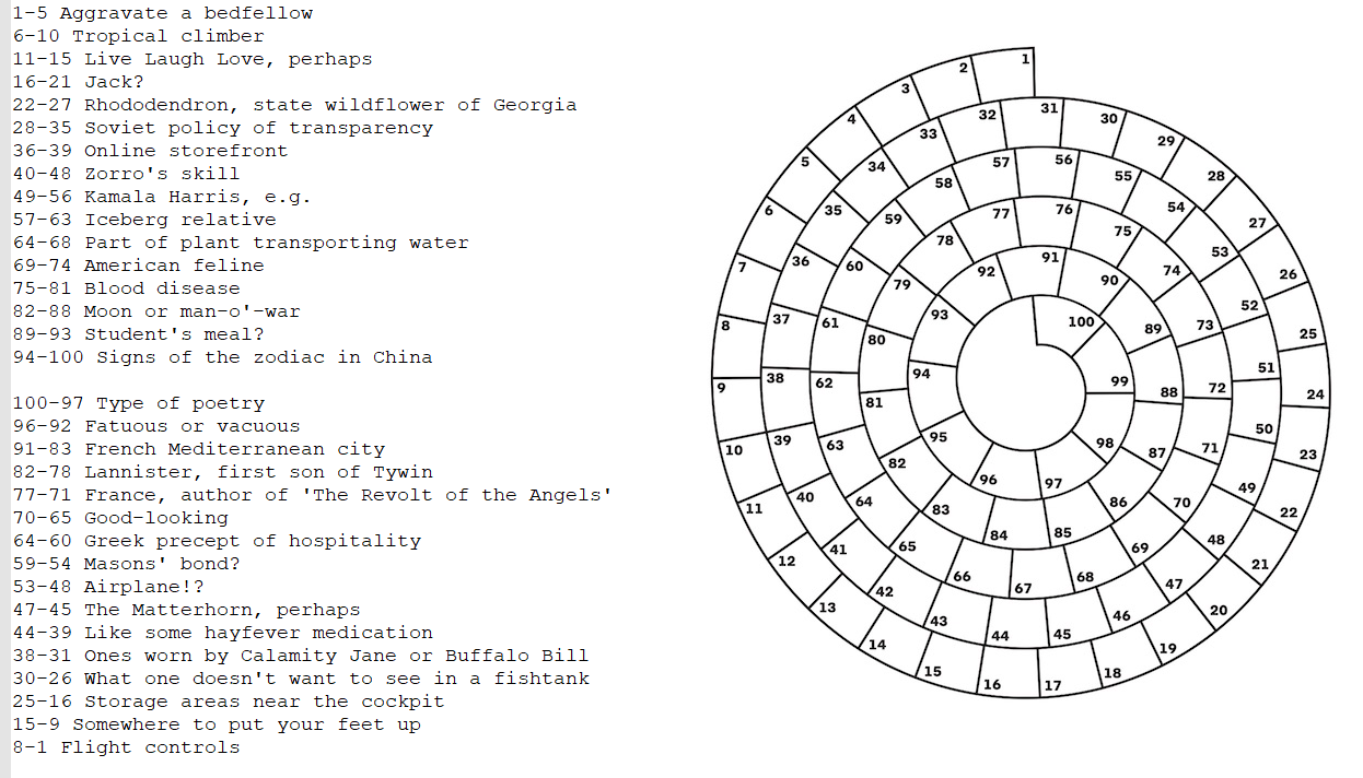 Hey everyone! For this puzzle, the two sets of clues produce the same 100-letter string, except that each is the reverse of the other. Have fun!