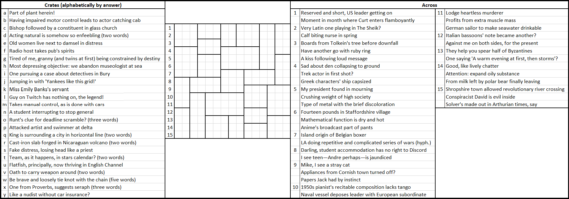 - each crate (a-y) contains a single word or phrase, clued on the left alphabetically by answer.