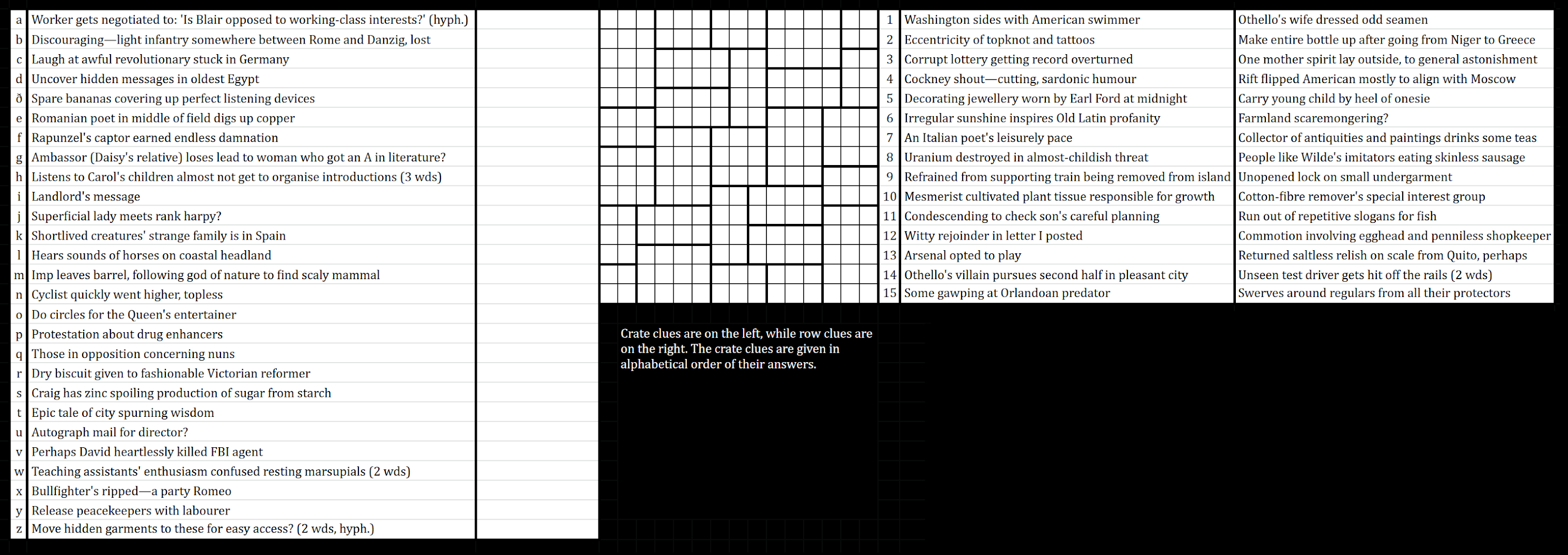 - each crate (a-z) contains a single word or phrase, clued on the left alphabetically by answer.